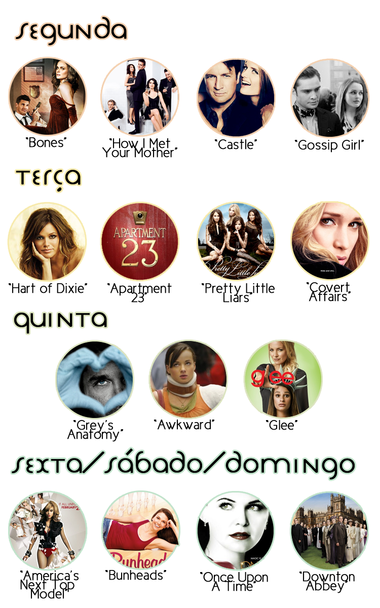 Adoro s??ries! Especialmente aquelas que ano ap??s ano s??o renovadas e nunca deixam de ser interessantes (nada contra as s??ries de s?? uma [ou com sorte duas] temporadas, mas todos n??s j?? ficamos tristes por causa de s??ries dessas que adoramos e depois n??o temos a continuidade) e dedico sempre uma parte do meu fim-de-semana para ver os epis??dios da semana que passou e met??-las em dia! De momento estas s??o as que eu vejo: