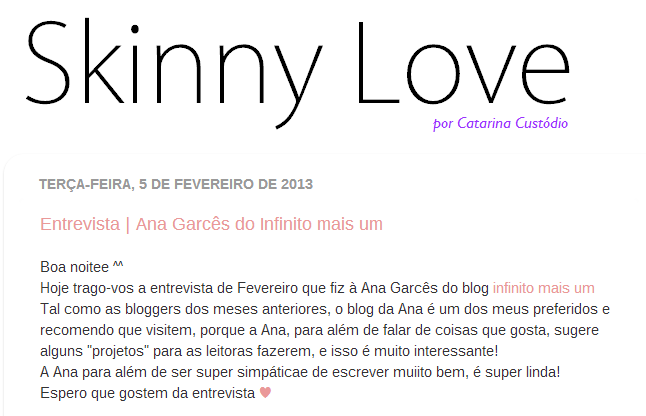 Tive, mais uma vez, o prazer de ser entrevistada. Desta vez pela Catarina, a menina por detr??s do blog Skinny Love.