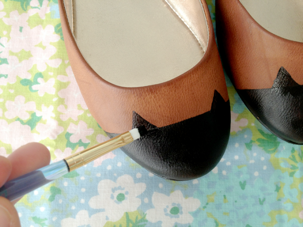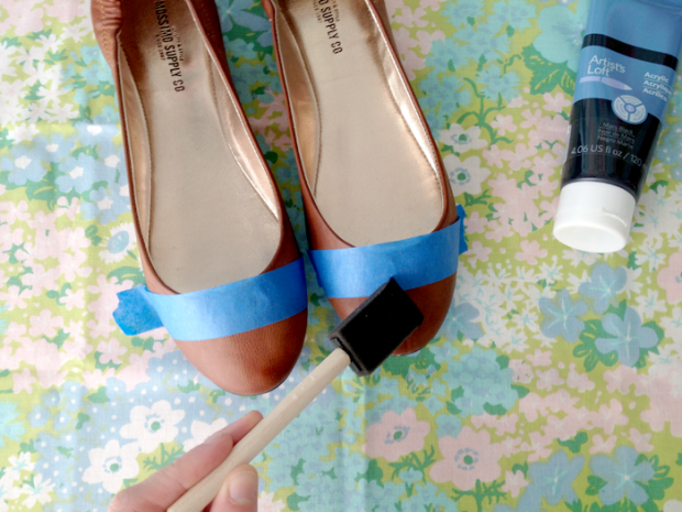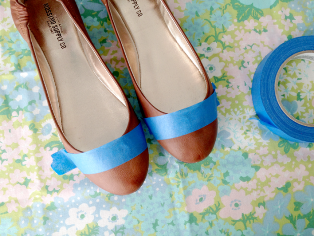 Passo 1: Colocar a fita adesiva a meio da biqueira e pression??-la bem para que a tinta n??o passe para o outro lado. Dependendo da qualidade da tinta e da cor da sabrina/loafer que estiverem a usar podem passar as camadas que voc??s acharem necess??rias para deixarem a cor homog??nea.