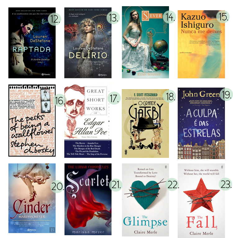 1. “Delirium”, The Book Depository ???6,88; 2. “Pandemonium”, The Book Depository ???6,78; 3. “Requiem”, The Book Depository ???12,96; 4. “A Rapariga Que Roubava Livros”, Bertrand ???22,21; 5. “Uglies 1: Imperfeitos”, FNAC ???12,95; 6. “Uglies 2: Perfeitos”, FNAC ???16,99; 7. “Uglies 3: Especiais”, FNAC ???16,99; 8. “Uglies 4: Excepcionais”, FNAC ???16,99; 9. “Uni??o”, Bertrand ???16,90; 10. “Crossed”, The Book Depository ???6,72; 11. “Reached”, The Book Depository ???6,87; 12. “Raptada”, Bertrand ???14,99; 13. “Del??rio”, Bertrand ???14,36; 14. “Sever”, The Book Depository ???10,21; 15. “Nunca Me Deixes”, FNAC ???17,16; 16. “The Perks of Being A Wallflower”, FNAC ???8,20; 17. “Great Short Works of Edgar Allan Poe”, FNAC ???10; 18. “O Grande Gatsby”, FNAC ???11,95; 19. “A Culpa ?? Das Estrelas”, FNAC ???15,90; 20. “Cinder”, Bertrand ???15,98; 21. “Scarlet”, The Book Depository ???6,88; 22. “The Glimpse”, The Book Depository ???7,71; 23. “The Fall”, The Book Depository ???7,86; 24. “A Jangada de Pedra”, FNAC ???16,90; 25. “As Intermit??ncias da Morte”, FNAC ???16,90; 26. “Starters”, The Book Depository ???10,01; 27. “Enders”, The Book Depository ???13,59; 28. “The Catastrophic History of You and Me”, The Book Depository ???6,79; 29. “??gua aos Elefantes”, FNAC ???20,14