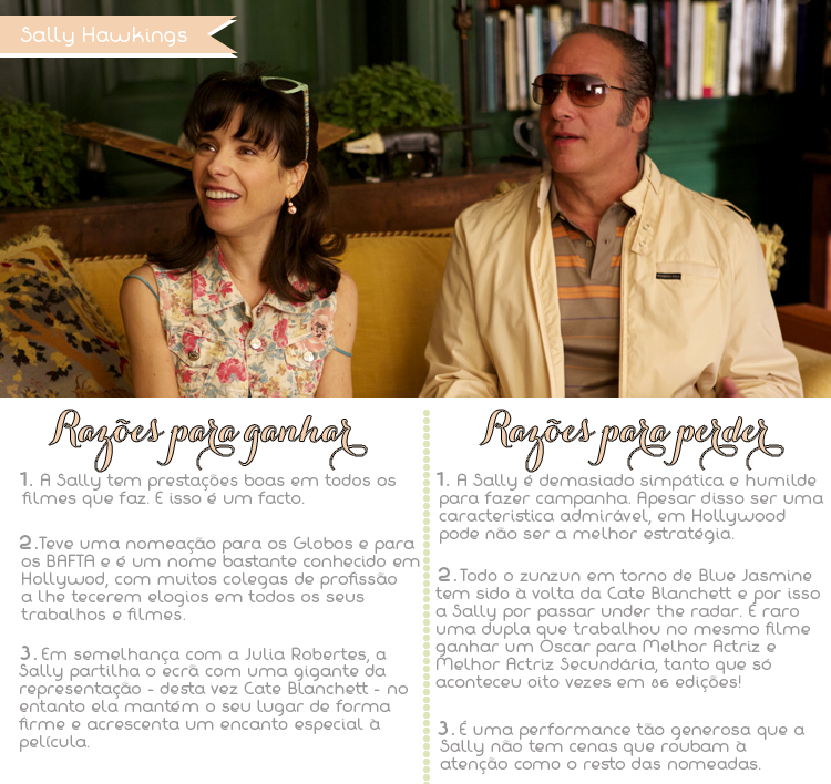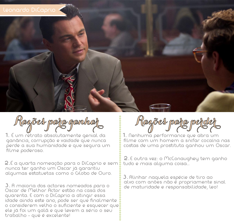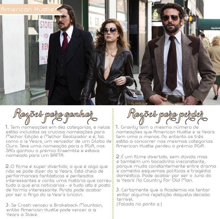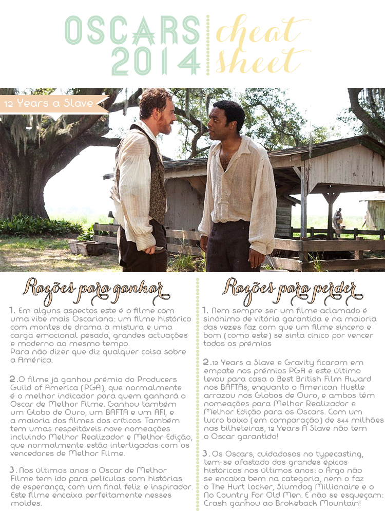 Verdade seja dita: por mais que gostemos dos Oscars por vezes ?? imposs??vel ver todos os filmes nomeados, conhecer todos os actores e mimimi ou porque ?? demasiada informa????o, ou porque estamos ocupados da vida e ?? imposs??vel apanhar tudo ou simplesmente porque n??o gostamos de um determinado g??nero/actor. Eu entendo, n??o se preocupem! Mas a pensar nisso e porque os Oscars s??o j?? este Domingo decidi fazer um Oscars 2014 Cheat Sheet. E o que ?? isso?, perguntam voc??s. Simples: mostro-vos os nomeados e os seus pontos fortes e fracos. Por outras palavras: mostro-vos os nomeados e as raz??es que os podem levar a ganhar uma estatueta ou n??o.