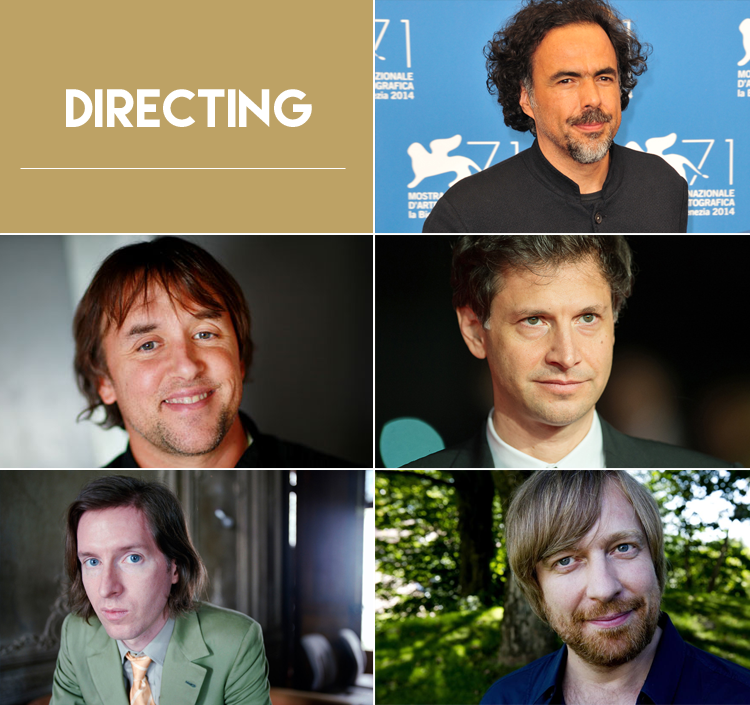 ALEJANDRO G. I????RRITU por BIRDMAN | RICHARD LINKLATER por BOYHOOD | BENNETT MILLER por FOXCATCHER | WES ANDERSON por THE GRAND BUDAPEST HOTEL | MORTEN TYLDUM por THE IMITATION GAME