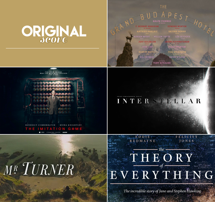 ALEXANDRE DESPLAT por THE GRAND BUDAPEST HOTEL | ALEXANDRE DESPLAT por THE IMITATION GAME | HANS ZIMMER por INTERSTELLAR | GARY YERSHON por MR. TURNER | J??HANN J??HANNSSON por THE THEORY OF EVERYTHING
