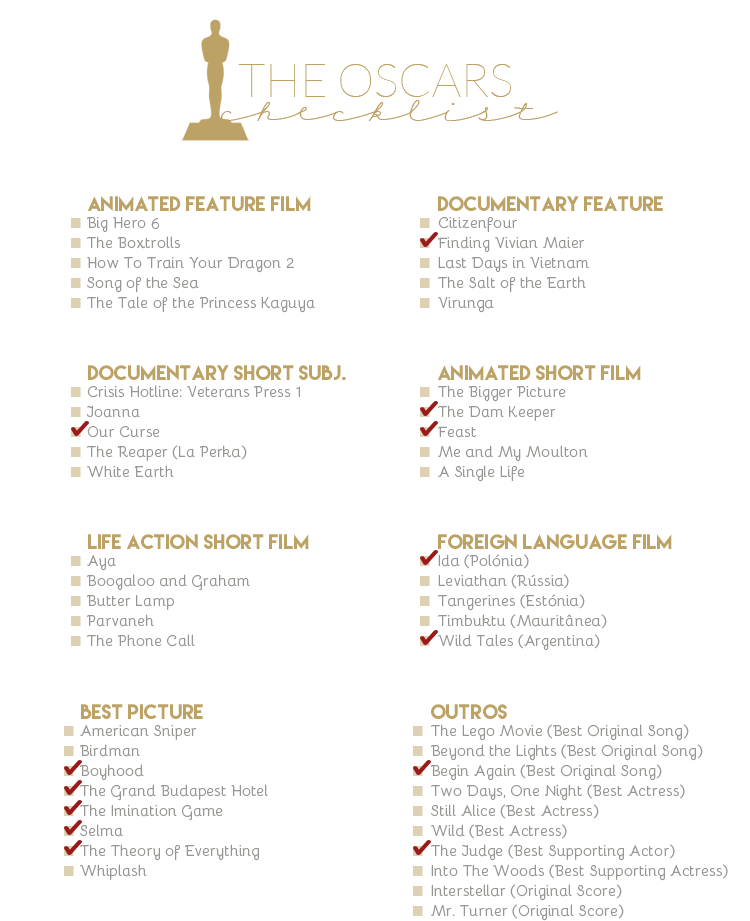 Eu ainda s?? vi o "Boyhood", "The Grand Budapest Hotel", "Begin Again" e "Into the Woods". Basicamente vi pouqu??ssimos filmes, mas mesmo assim gostava de ver o "Boyhood" a ganhar a categoria de melhor filme, e o Eddie Redmayne e a Emma Stone nas categorias de melhores actores.