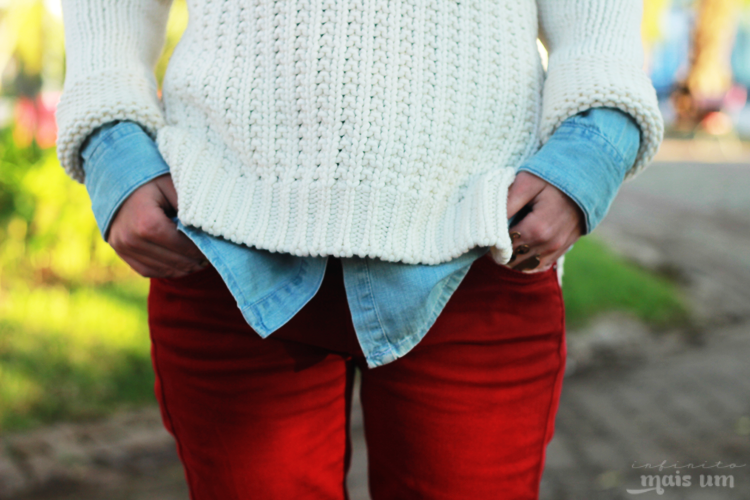 Juntei-lhe uma malha quentinha, uma camisola de ganga e umas cal??as coloridas para um outfit descontra??do e em modo Michelin porque est?? um frio danado e o que a malta quer ?? estar aconchegada.