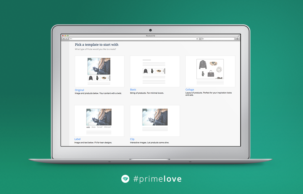 Depois ?? s?? escolher o tipo de imagem interactiva que queremos usar – e vamos ter cinco templates ?? escolha – para de seguida passarmos para a ??rea de cria????o da imagem interactiva (chamada de Pulse) onde come??amos por fazer o upload da nossa imagem e, logo depois, fazermos uma pesquisa e taggar os produtos que promovemos nela.